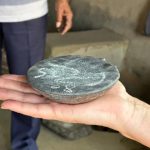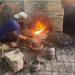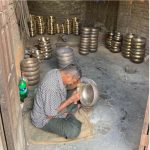 We use a special ash mixture for the final polish of the Singing Bowl . Rice straw and mustard oil are burnt and mixed into a creamy paste. This mixture is used to carefully polish the Singing Bowl for several minutes to remove any remaining impurities. This final step also gives the Singing Bowl its typical shiny surface.